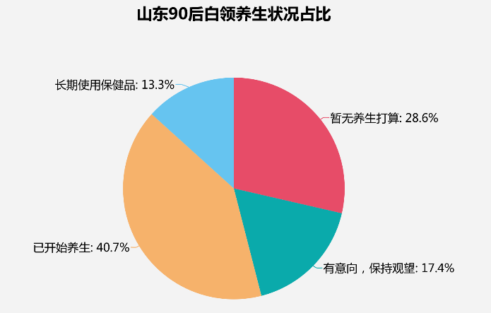 據(jù)統(tǒng)計(jì),現(xiàn)如今中國有一大部分年輕人都開始注重養(yǎng)生,且山東省90后已經(jīng)有過半年輕人開始養(yǎng)生。下圖為山東90后白領(lǐng)養(yǎng)生狀況占比,據(jù)調(diào)查顯示,已有40.7%的白領(lǐng)開始養(yǎng)生;更有13.3%白領(lǐng)表示長期在使用保健品;有17.4%的白領(lǐng)意向養(yǎng)生并持觀望態(tài)度;僅有28.6%的白領(lǐng)表示無養(yǎng)生打算。