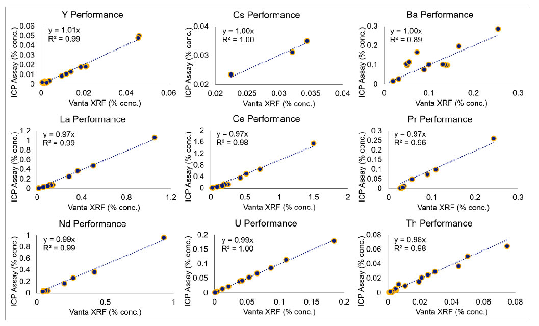 使用Vanta手持式XRF光譜儀,可以對(duì)稀土進(jìn)行檢測(cè)。手持XRF光譜儀在檢測(cè)各種礦產(chǎn)品樣品(包括氟碳酸鹽和次生磷酸鹽)時(shí),表現(xiàn)出非常高的性能。氟碳酸鹽通常是氟碳鈰礦,可提供釔、鈰和鑭;而磷酸鹽通常是獨(dú)居石,不僅含有鑭、鈰、鐠和釹,還含有較重的稀土元素釤和釓,以及放射性較弱的釷。正如每個(gè)圖表所示,元素的斜率和R2都接近于1,說明Vanta在檢測(cè)氟碳鈰礦石和獨(dú)居石時(shí)均表現(xiàn)出很高的準(zhǔn)確性。