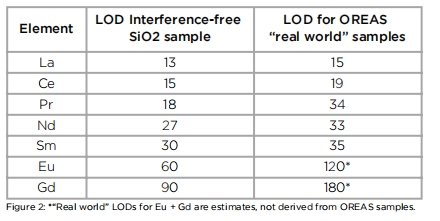 手持設(shè)備中的典型的X射線管只能工作到50 kV,稀土元素的有效激發(fā)能量差。而SciAps X-555采用55 kV的X射線管,大約能產(chǎn)生10倍以上的X射線有效激發(fā)能量。無干擾(二氧化硅)和高度具有挑戰(zhàn)性的OREAS REE礦石的值(這可以在圖2中找到)。LOD用于背景以上的3西格瑪檢測,120秒的測試時間。Sciaps光譜儀可作為化探手段。有規(guī)劃的進行土壤、巖石露頭測試,剖面測試,光譜數(shù)據(jù)可作為地質(zhì)資料。常用礦石模式和土壤模式。無需進行樣品制備或簡單樣品制備。