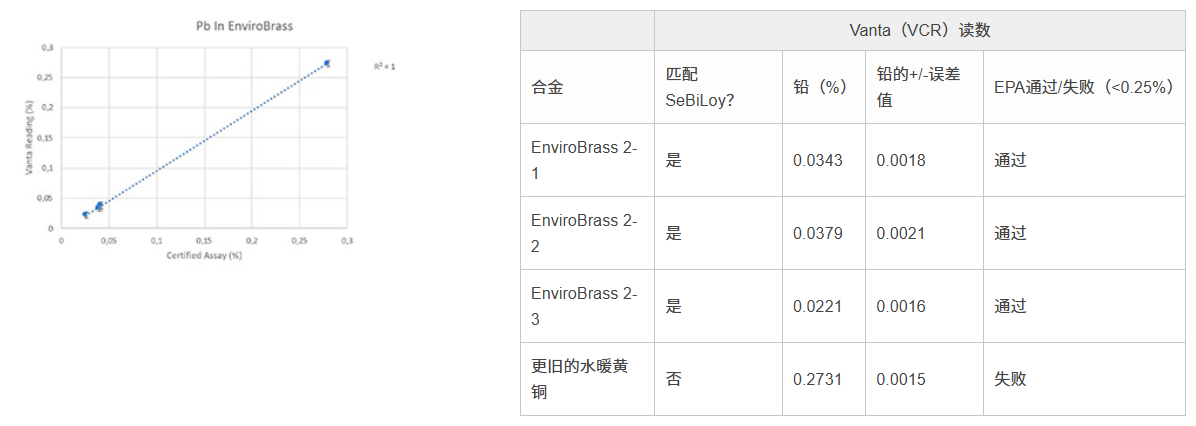 我們可以使用Vanta VCR型號分析儀,分析多種黃銅和銅合金認證參考材料(CRM),以辨別出不同的重金屬和受到監(jiān)管的元素。Vanta XRF分析儀具有探測各種不同環(huán)境黃銅中低水平鉛元素的優(yōu)質(zhì)性能,可以確保所用水暖材料符合0.25%鉛含量的要求,如下圖所示。在所完成的鉛元素定量分析的過程中,10多次檢測的結果表明:鉛的含量都低于監(jiān)管的操作水平。此外,我們還分析了一個更舊的不符合規(guī)范的黃銅樣件,以進行對比分析。