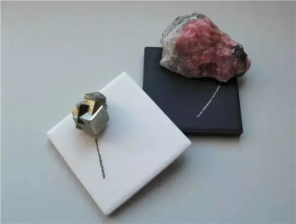 透明礦物菱錳礦的條痕為白色(右)