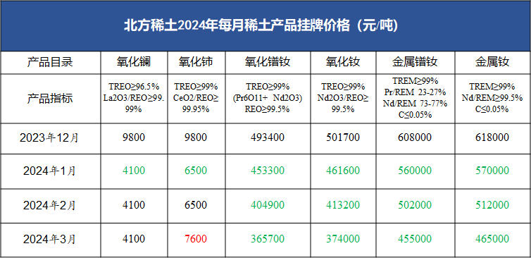 北方稀土2024年Q1掛牌價(jià)格