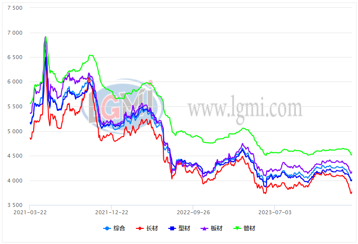 具體來看,蘭格鋼鐵長材絕對價(jià)格指數(shù)為3766元,較去年同期下降14.8%;蘭格鋼鐵型材絕對價(jià)格指數(shù)為3997元,較去年同期下降12.5%;蘭格鋼鐵板材絕對價(jià)格指數(shù)為4175元,較去年同期下降11.1%;蘭格鋼鐵管材絕對價(jià)格指數(shù)為4518元,較去年同期下降10.6%。