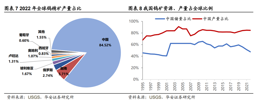 同時,中國也是世界上鎢產(chǎn)量最豐富的國家。根據(jù)美國地調(diào)局(USGS)統(tǒng)計(jì),2022年全球鎢礦產(chǎn)量8.4萬噸,其中中國產(chǎn)量7.1萬噸,約占全球總產(chǎn)量的84.5%。