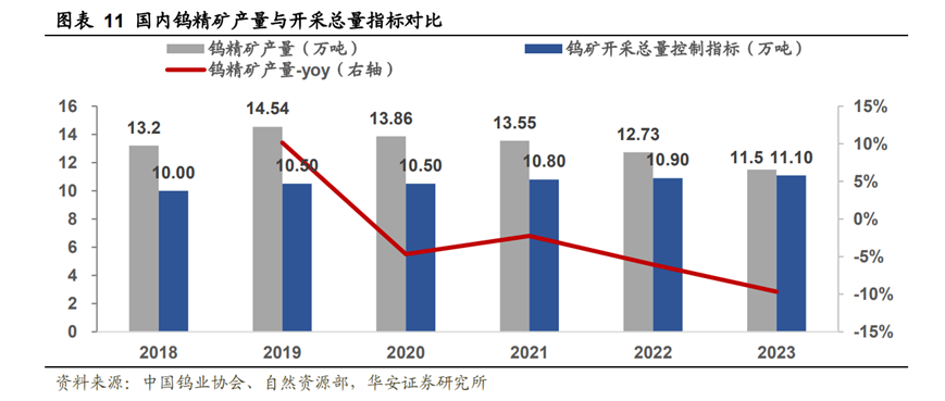 今年3月,自然資源部下達(dá)了2024年度首批僅為6.2萬噸的鎢礦開采總量控制指標(biāo),規(guī)模的收縮意味著國內(nèi)鎢精礦產(chǎn)量將延續(xù)下滑趨勢。隨著中國對鎢資源采取總量控制、出口配額管理、國家收儲等逐步收緊行業(yè)政策的實(shí)施,預(yù)計(jì)未來全球鎢礦供應(yīng)將逐步趨緊,鎢的產(chǎn)量增速將逐步放緩。