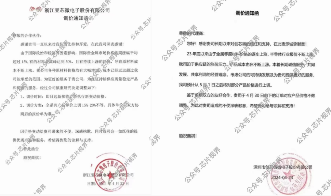 國(guó)際貴金屬市場(chǎng)價(jià)格持續(xù)上漲,使得芯片制造的原材料成本不斷攀升,芯片廠(chǎng)商面臨巨大的成本壓力,近期紛紛宣布漲價(jià)。浙江亞芯微電子表示,全系列產(chǎn)品單價(jià)上調(diào)15%-20%不等;深圳市創(chuàng)芯微電子表示,5月1日起調(diào)漲部分產(chǎn)品價(jià)格;南京市智凌芯表示,全線(xiàn)系列產(chǎn)品調(diào)漲;無(wú)錫華眾微電子表示,部分產(chǎn)品價(jià)格上調(diào),幅度為10-20%。