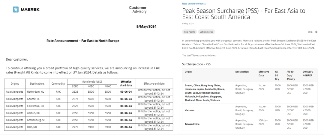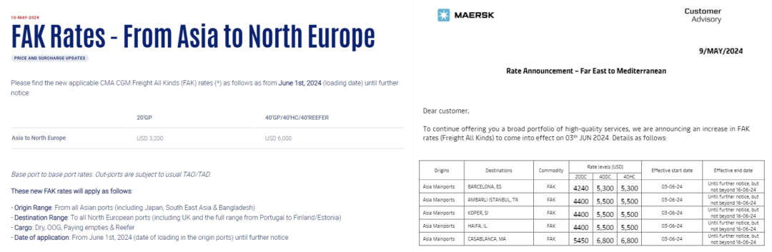 船公司們宣布新一輪運(yùn)價(jià)調(diào)整計(jì)劃,馬士基和達(dá)飛兩大航運(yùn)巨頭已宣布6月再提價(jià)計(jì)劃,上調(diào)北歐FAK費(fèi)率。其中,馬士基每40尺柜最高5900美元,達(dá)飛再次上調(diào)1000美元,每40尺柜6000美元。赫伯羅特、HMM等船公司繼續(xù)調(diào)整部分航線(xiàn)的費(fèi)率,涉及歐地、非洲、南美、北美等。5月上旬美線(xiàn)(運(yùn)價(jià))已經(jīng)連漲了兩次,每次各漲了1000美元左右,漲價(jià)還將繼續(xù),并將在5月下旬飆升到5000美元以上。