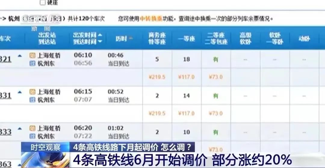 鐵路12306官網(wǎng)發(fā)布四則調(diào)價(jià)公告,自6月15日調(diào)整京廣高鐵武廣段、滬昆高鐵滬杭段、滬昆高鐵杭長(zhǎng)段、杭深鐵路杭甬段等4條熱門(mén)高鐵線(xiàn)路票價(jià),漲幅在19%-20%左右。