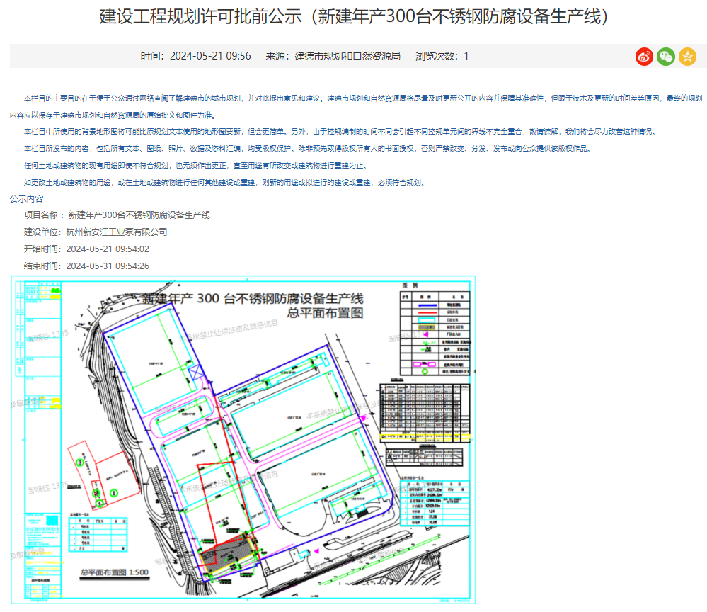 建德市人民政府消息,5月21日,建德市規(guī)劃和自然資源局就杭州新安江工業(yè)泵有限公司新建年產300臺不銹鋼防腐設備生產線建設工程規(guī)劃許可進行批前公示,公示期:5月21-31日。