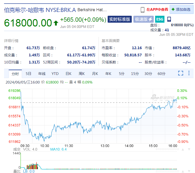 據(jù)悉,巴菲特從2019年首次投資西方石油,2022年一季度開(kāi)始連續(xù)三個(gè)季度大幅增持。今年2月初,巴菲特曾連續(xù)三個(gè)交易日增持西方石油,累計(jì)購(gòu)買430萬(wàn)股。截至當(dāng)?shù)貢r(shí)間6月5日收盤,伯克希爾-哈撒韋美股報(bào)618000美元,漲幅0.09%,市值8879.40億美元。