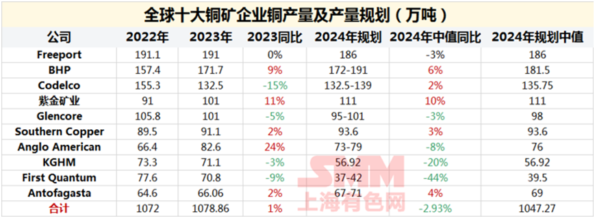 統(tǒng)計2023年全球十大龍頭礦企的產(chǎn)量數(shù)據(jù)顯示,智利國家銅業(yè)公司Codelco2023年產(chǎn)量降幅高達15%,第一量子First Quantum下降9%,嘉能可Glencore和波蘭KGHM產(chǎn)量分別下降5%和3%。據(jù)計算,十大龍頭礦企2023年總產(chǎn)量增幅僅為1%。