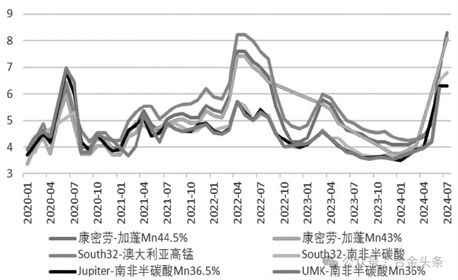 圖為錳礦外盤(pán)報(bào)價(jià)(單位:美元/噸度)
