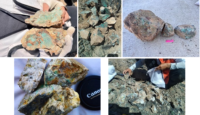 其中1處銅(金)多金屬礦帶走向近東西向,初步控制礦帶長約400米,寬約20米,帶內(nèi)見大量孔雀石、石英褐鐵礦化及原生黃銅礦,快速分析儀顯示新鮮面銅普遍大于5%(孔雀石化處銅大于70%),同時有金、鉛、鋅顯示。另一處銅金多金屬礦帶走向280度,斷續(xù)長近600米,寬10-20米不等,帶內(nèi)發(fā)現(xiàn)多處硅化銅鉛礦體,主要為孔雀石、黃銅礦及方鉛礦,目估銅品位大于5%。另外幾處銅礦點經(jīng)地表取樣也發(fā)現(xiàn)塊狀富銅礦體,目估化學(xué)樣品位銅大于5%。