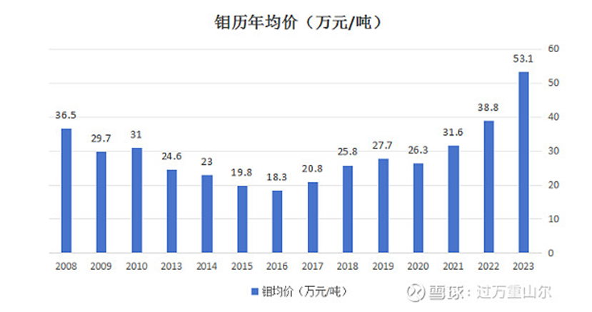 自2017年以來(lái),在鉬供應(yīng)端產(chǎn)量保持穩(wěn)定,而鉬需求穩(wěn)步提升的背景下,全球和國(guó)內(nèi)鉬行業(yè)供需格局都呈現(xiàn)緊平衡狀態(tài),鉬價(jià)格也進(jìn)入上漲周期,2023年鉬均價(jià)達(dá)到了53.1萬(wàn)噸。未來(lái)兩年,鉬的供給端增量不大,增量集中于2027年及以后,主要是沙坪溝項(xiàng)目投產(chǎn),新增2.72萬(wàn)噸產(chǎn)能,以及大黑山鉬礦擴(kuò)產(chǎn),新增0.64萬(wàn)噸。