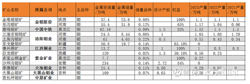 從企業(yè)來(lái)看,國(guó)內(nèi)鉬礦相關(guān)有金鉬股份、洛陽(yáng)鉬業(yè)、中國(guó)中鐵(鹿鳴礦業(yè))、江西銅業(yè)(德興銅礦)、紫金礦業(yè)(巨龍銅礦、沙坪溝鉬礦、多寶山銅礦)等,上述5家企業(yè)2023年合計(jì)產(chǎn)量約7.16萬(wàn)噸,約占國(guó)內(nèi)市場(chǎng)的65%。金鉬股份是國(guó)內(nèi)最大的鉬礦開采及鉬產(chǎn)品生產(chǎn)商,擁有陜西的金錐城鉬礦與河南的東溝鉬礦兩個(gè)核心礦山,產(chǎn)能都在一萬(wàn)噸左右。