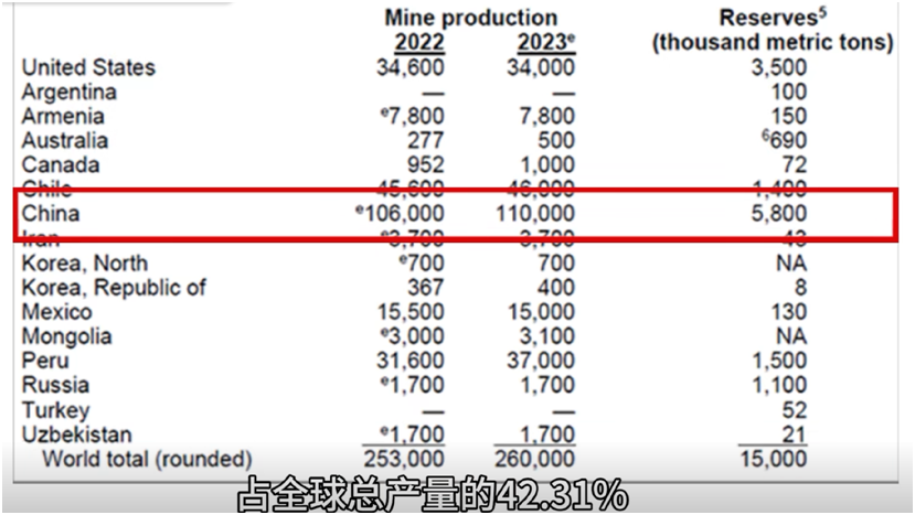 鉬,作為一種重要的不可再生的稀缺性戰(zhàn)略資源,以其獨(dú)特的性能廣泛應(yīng)用于鋼鐵冶金、農(nóng)用化肥、電氣化工和航天等領(lǐng)域。根據(jù)USGS數(shù)據(jù)顯示,2023年,中國(guó)鉬礦資源儲(chǔ)量為580萬(wàn)噸,占全球資源儲(chǔ)量的38.67%。其次為美國(guó)和秘魯,2023年鉬礦資源儲(chǔ)量分別為350萬(wàn)噸和150萬(wàn)噸,分別占比23.33%和10.00%。同時(shí),中國(guó)也是全球最大的鉬生產(chǎn)國(guó),據(jù)美國(guó)地質(zhì)調(diào)查局?jǐn)?shù)據(jù)顯示,2023年,全球鉬產(chǎn)量約26萬(wàn)噸,其中,中國(guó)約11萬(wàn)噸,約占全球總產(chǎn)量的42.3%。