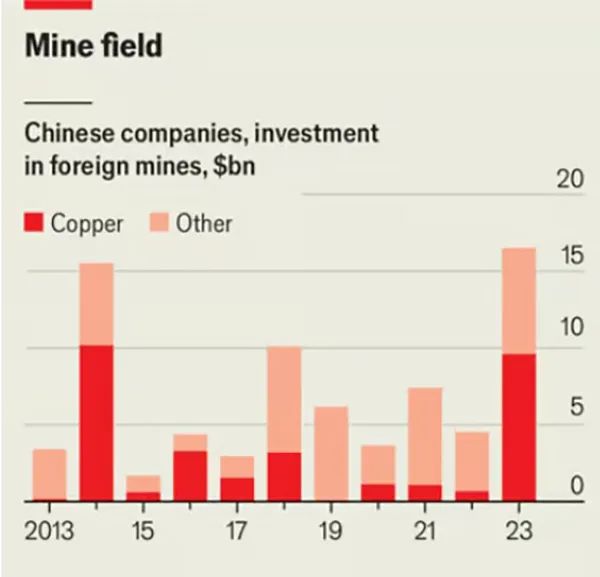 在具體礦產(chǎn)投資上,中國公司也非常具有戰(zhàn)略性。《經(jīng)濟(jì)學(xué)人》稱,隨著中國在電池、電動(dòng)汽車和太陽能電池板等產(chǎn)品上越來越具有競爭力,中國對(duì)海外礦業(yè)的投資也越來越多。銅礦是電氣化的重要材料,去年中國企業(yè)對(duì)這種這礦產(chǎn)的投資約占其海外礦產(chǎn)投資的3/5。