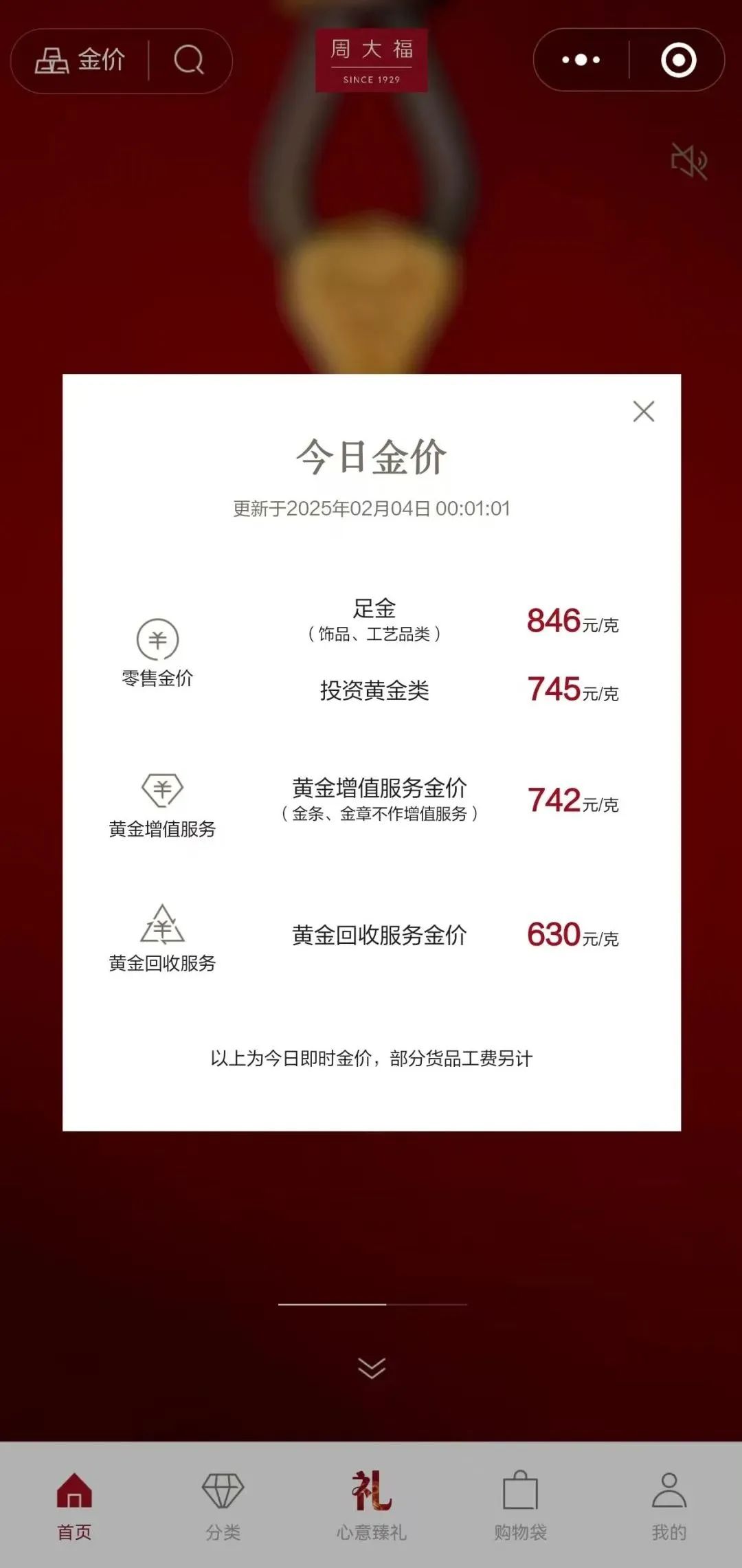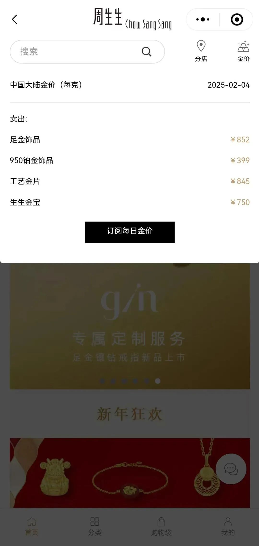 2月4日,周大福官網(wǎng)報出的足金飾品價格為846元/克,周生生報出的價格更是達到852元/克,均為品牌足金飾品售價的歷史高位。