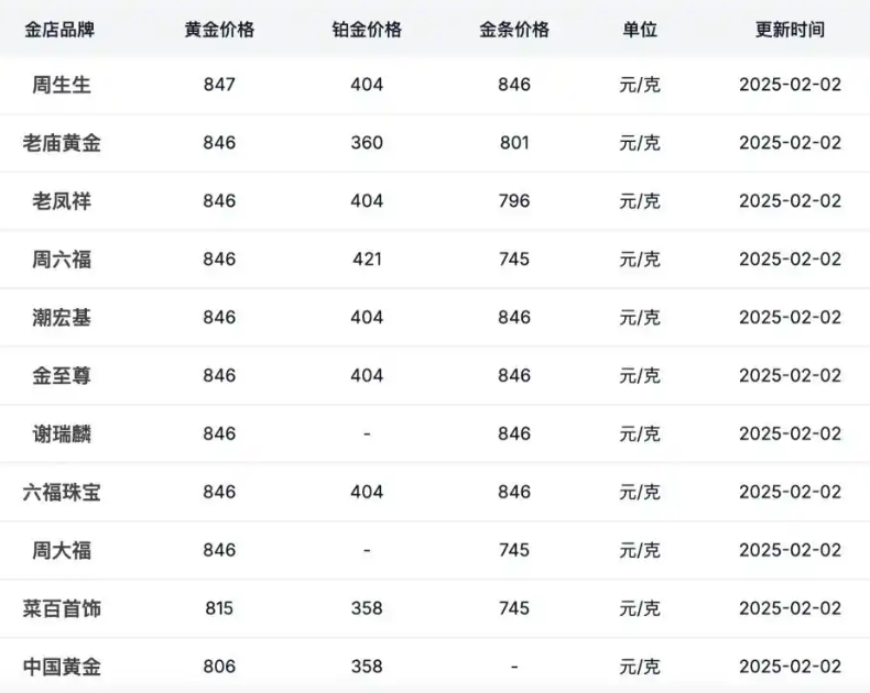 國內(nèi)零售端品牌足金飾品的價格同樣水漲船高。2月2日,國內(nèi)黃金珠寶品牌足金首飾價格最高已突破847元/克。