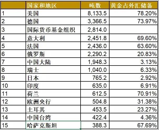 截至2020年2月,全球前十五官方黃金儲(chǔ)備數(shù)據(jù)一覽: