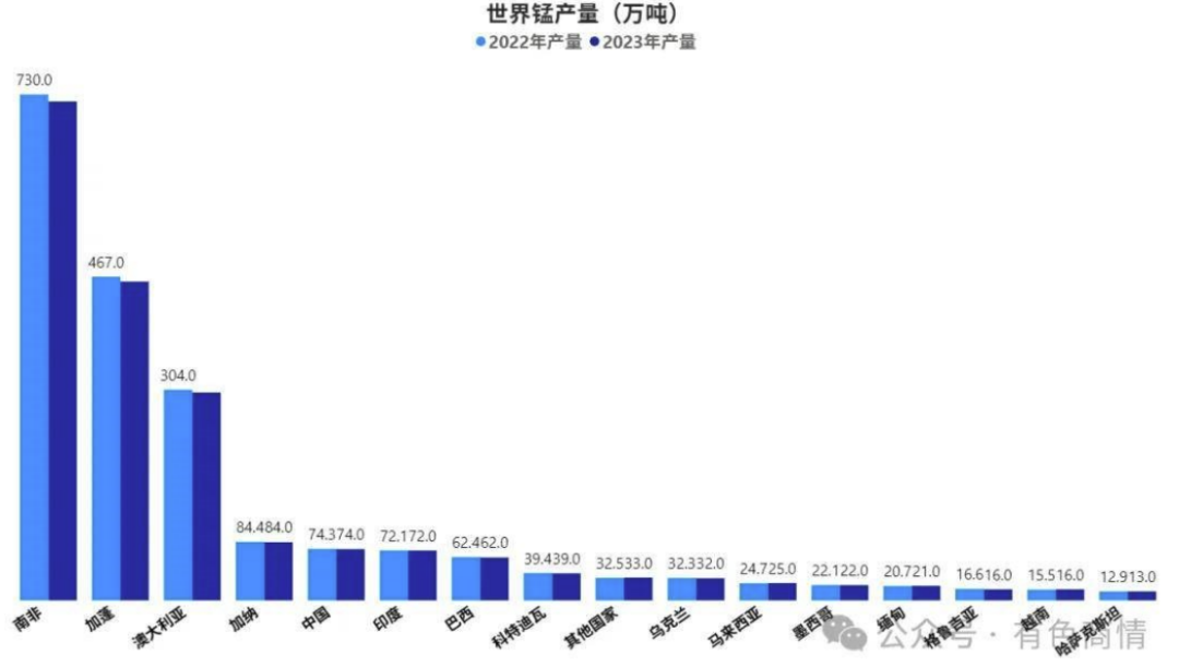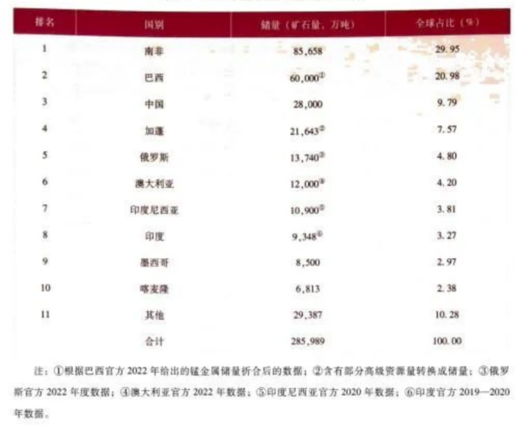 錳礦,是一種非常重要的戰(zhàn)略礦產(chǎn)資源,尤其是富錳礦和優(yōu)質(zhì)錳礦資源,已經(jīng)被中國列入到緊缺的礦種。錳及其化合物應(yīng)用于國民經(jīng)濟(jì)的各個(gè)領(lǐng)域,每輛特斯拉Model 3需要6.8公斤錳,而比亞迪刀片電池的磷酸錳鋰技術(shù)對(duì)高純度錳需求激增,錳已成為鋼鐵、新能源、新材料等產(chǎn)業(yè)的基本原料。從儲(chǔ)量分布來看,根據(jù)中國地調(diào)局發(fā)布的《全球礦產(chǎn)資源儲(chǔ)量評(píng)估報(bào)告2024》顯示,全球錳儲(chǔ)量28.6億噸(礦石量,下同),主要分布在南非(29.95%)、巴西(20.98%)、中國(9.79%)和加蓬(7.57%)等國,俄羅斯、澳大利亞、印度尼西亞、印度、墨西哥和喀麥隆等國家也有少量分布。