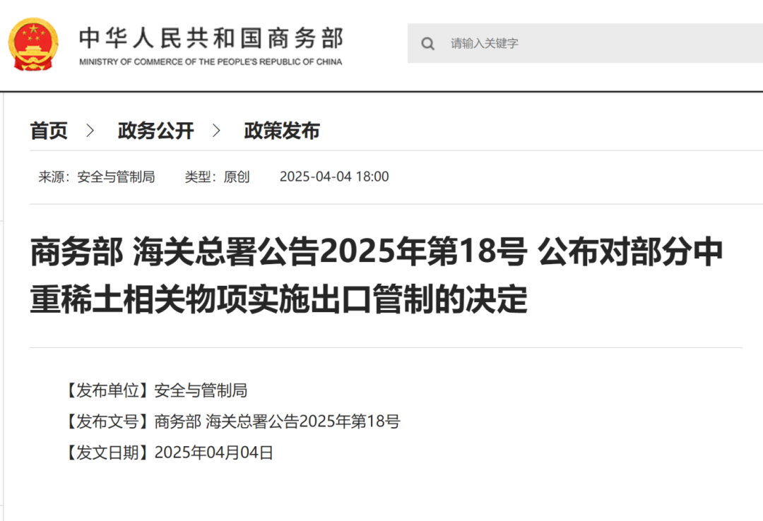 根據(jù)《中華人民共和國出口管制法》等有關(guān)法律法規(guī),4月4日,商務(wù)部會(huì)同海關(guān)總署發(fā)布關(guān)于對(duì)釤、釓、鋱、鏑、镥、鈧、釔等7類中重稀土相關(guān)物項(xiàng)實(shí)施出口管制措施的公告,并于發(fā)布之日起正式實(shí)施。