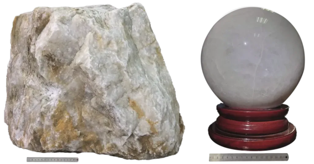 我國脈石英高純石英優(yōu)質(zhì)原料或A級(jí)礦(左)和安哥拉脈石英加工的石英球(右)。成都自然博物館(成都理工大學(xué)博物館)/ 藏
