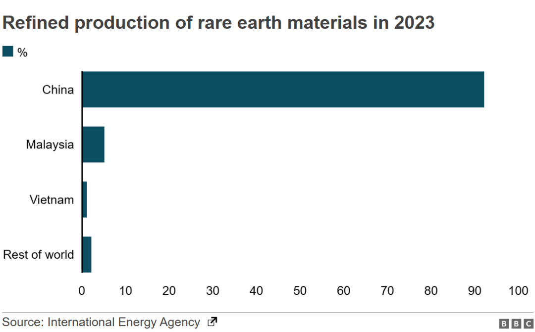 二是技術先進。中國在稀土精煉和高端磁體制造方面掌握核心科技,控制著全球超過90%的稀土精煉產能,高性能釹鐵硼永磁體的生產也由中國主導,全球產量超過90%。