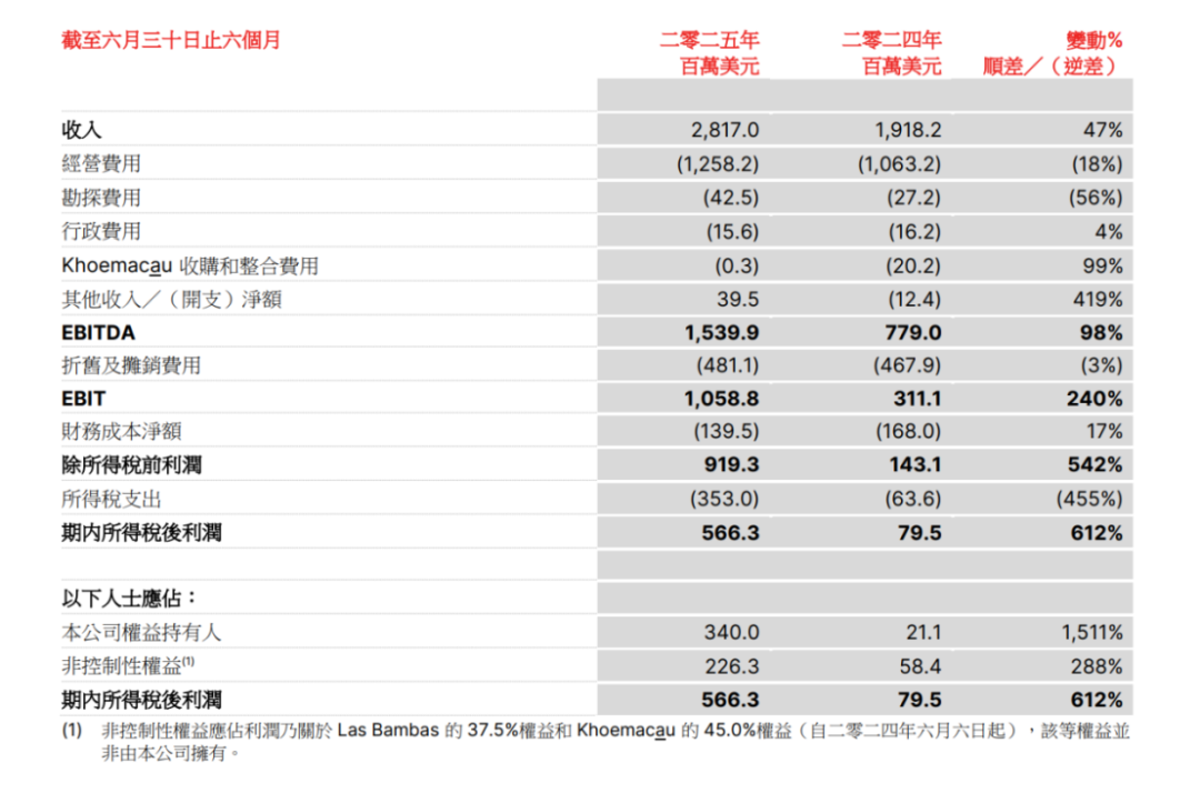 8月12日晚間,五礦資源披露半年業(yè)績,2025年上半年,五礦資源實現(xiàn)收入28.17億美元,同比增長47%;除稅后利潤達5.663億美元,與上年同期的0.795億美元相比,實現(xiàn)了612%增長;公司權(quán)益持有人應(yīng)占利潤3.40億美元,與上年同期的0.211億美元相比,實現(xiàn)了超過15倍的增長。
