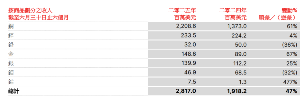 2025年上半年,倫敦金屬交易所(LME)金、銀、鈷等金屬價格分別上漲39%、26%、7%,也帶動五礦資源相關(guān)板塊營收的增長。當然,五礦資源業(yè)績的“爆發(fā)”主要得益于銅板塊的量價齊升!