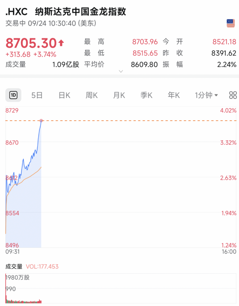 截至收盤,納斯達克中國金龍指數(shù)收漲2.83%,熱門中概股普漲。
