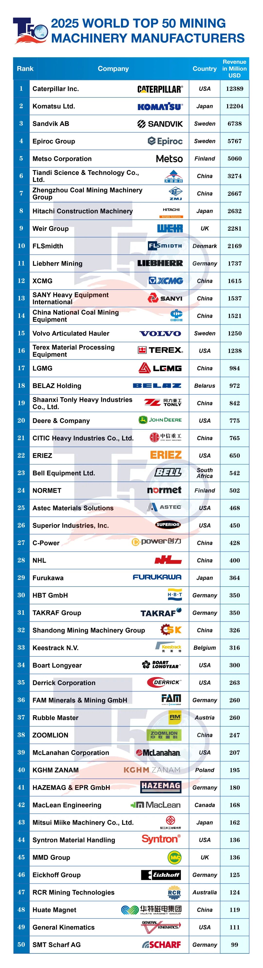 近日,“2025 全球礦山設(shè)備制造商 50 強” 榜單在印度尼西亞雅加達舉辦的 T50 峰會亞洲論壇上正式揭曉,揭示了全球礦業(yè)裝備制造業(yè)正在經(jīng)歷深刻變革。本屆榜單顯示,全球礦山設(shè)備制造行業(yè)總銷售額為 766.55 億美元,較上年下降 4.0%,行業(yè)競爭格局出現(xiàn)新變化,其中中國企業(yè)表現(xiàn)尤為搶眼。