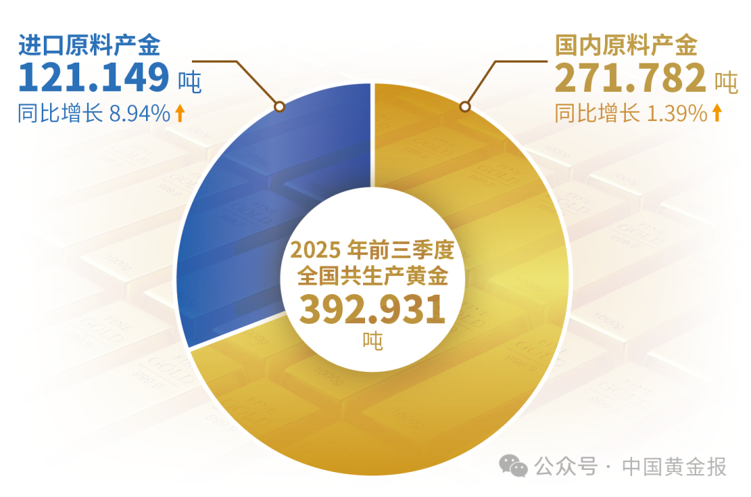 黃金生產(chǎn) 據(jù)中國黃金協(xié)會最新統(tǒng)計(jì)數(shù)據(jù)顯示:2025年前三季度,國內(nèi)原料產(chǎn)金271.782噸,比2024年同期增加3.714噸,同比增長1.39%。另有進(jìn)口原料產(chǎn)金121.149噸,同比增長8.94%。國內(nèi)原料和進(jìn)口原料共計(jì)生產(chǎn)黃金392.931噸,同比增長3.6%。