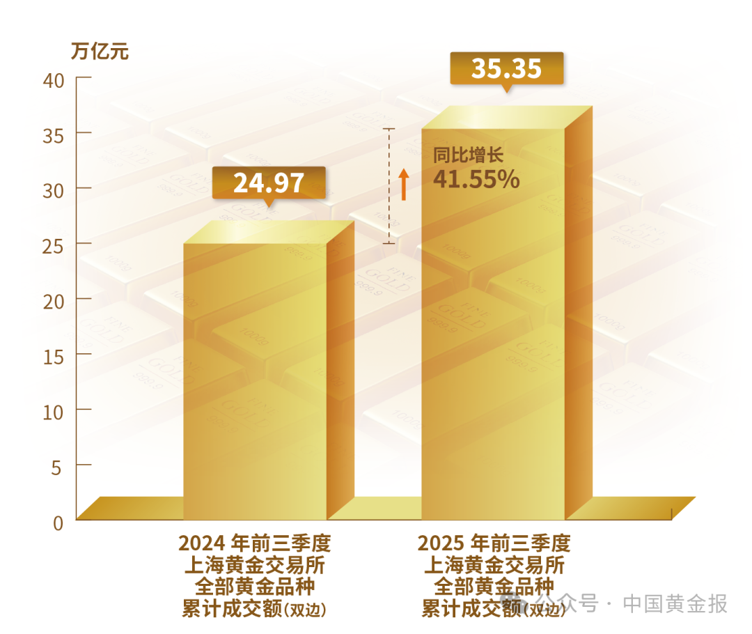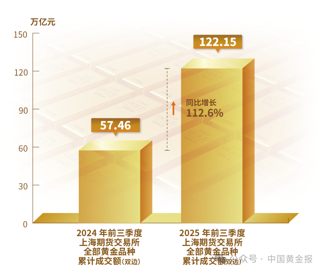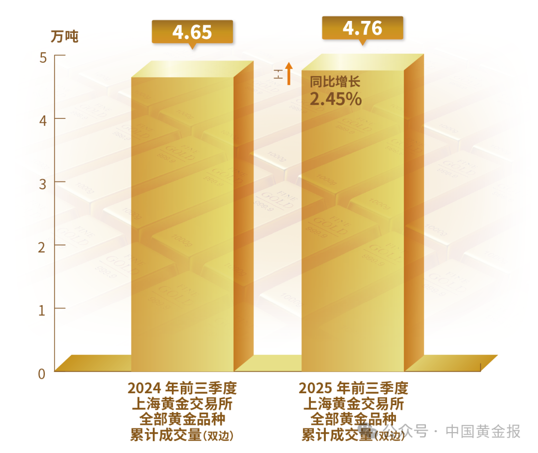 不同品類黃金產(chǎn)品的表現(xiàn)差異明顯。輕克重、附加值高的首飾產(chǎn)品仍保持較強(qiáng)市場吸引力,銷售情況較好。金條需求仍然旺盛,地緣沖突加劇與經(jīng)濟(jì)不確定性使得黃金避險(xiǎn)保值的功能進(jìn)一步凸顯。電子、新能源等產(chǎn)業(yè)的快速發(fā)展使得工業(yè)用金需求穩(wěn)步回升。 黃金市場 2025年前三季度,上海黃金交易所全部黃金品種累計(jì)成交量單邊2.38萬噸(雙邊4.76萬噸),同比上升2.45%;累計(jì)成交額單邊17.68萬億元(雙邊35.35萬億元),同比上升41.55%。上海期貨交易所全部黃金期貨期權(quán)累計(jì)成交量單邊10.36萬噸(雙邊20.72萬噸),同比上升59.98%;累計(jì)成交額單邊61.08萬億元(雙邊122.15萬億元),同比上升112.6%。
