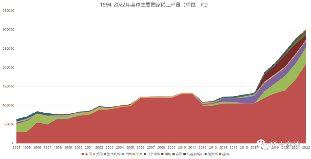 2022年全球稀土礦產(chǎn)量竟達(dá)到了30萬(wàn)噸,而中國(guó)占比提升至70%